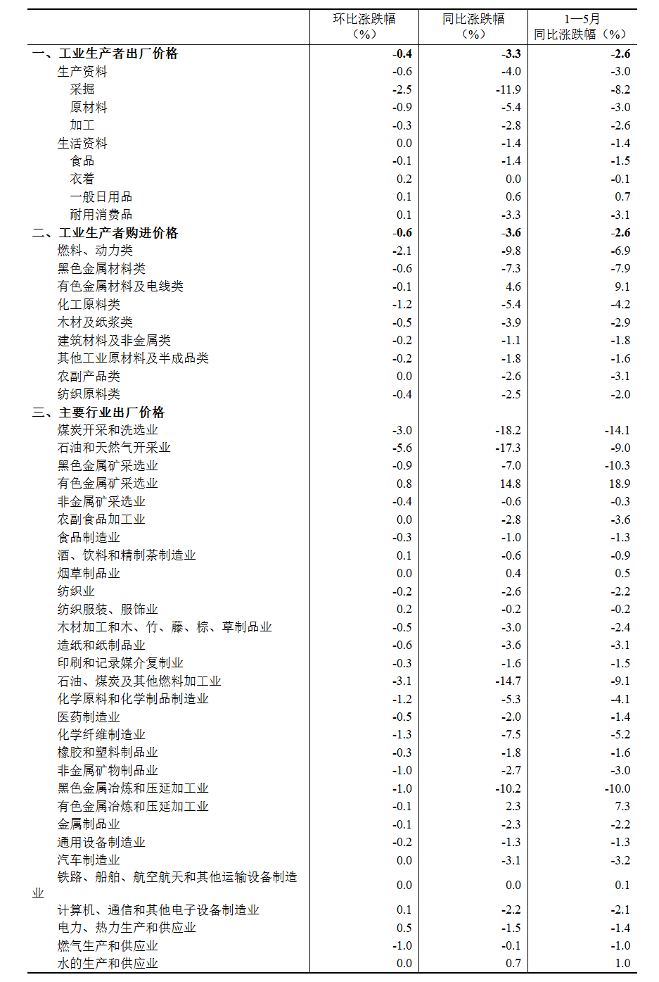 5月份,工业生产者出厂价格中,生产资料价格下降0.6%,影响工业生产者出厂价格总水平下降约0.44个百分点。其中,采掘工业价格下降2.5%,原材料工业价格下降0.9%,加工工业价格下降0.3%。生活资料价格持平。其中,食品价格下降0.1%,衣着价格上涨0.2%,一般日用品和耐用消费品价格均上涨0.1%。