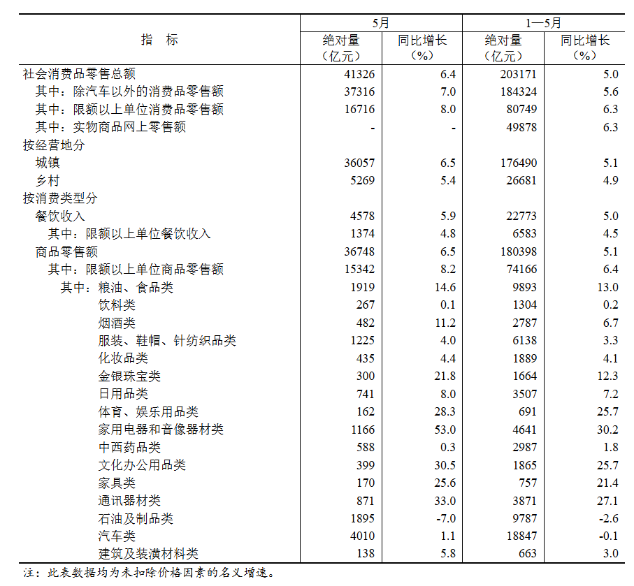 5月份,社会消费品零售总额41326亿元,同比增长6.4%。其中,除汽车以外的消费品零售额37316亿元,增长7.0%。1—5月份,社会消费品零售总额203171亿元,增长5.0%。其中,除汽车以外的消费品零售额184324亿元,增长5.6%。