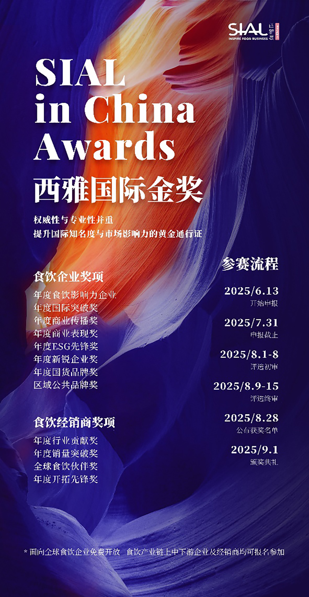 全球经济复苏的浪潮之下,食品饮料行业正经历着前所未有的变革,企业如何在激烈的竞争中精准触达目标客群、保持可持续增长?如何在品牌林立的市场中建立差异化宣传优势?无论是新锐品牌寻求拓展新渠,还是实力品牌亟待破圈营销,都需要一个兼具国际视野与全球影响力的展示平台,让自己“被看见、被认可、被选择”。SIAL西雅国际食品展作为食品饮料展览行业的引领者,深知在激烈的市场竞争中,只有持续创新、坚持品牌塑造、不断突破自身的企业才能脱颖而出。而SIAL西雅国际金奖——这一汇聚全球智慧的行业风向标,为企业发展提供强力支持!