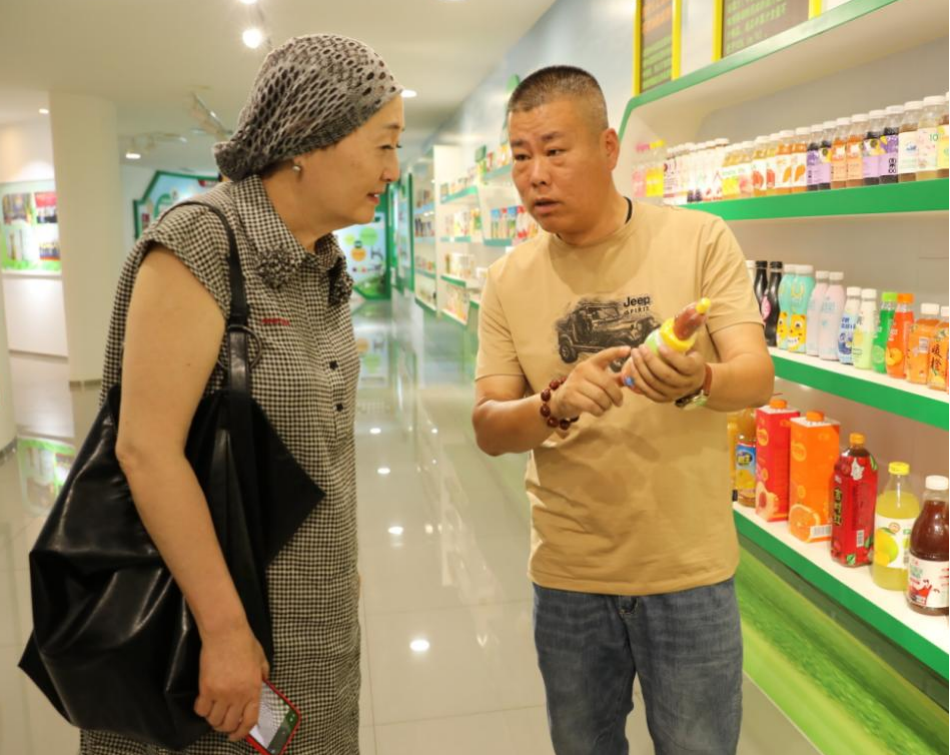 通过丰富的图文资料和实物展示,工作人员介绍了果汁系列、果肉饮品系列、NFC系列、儿童果汁系列、植物蛋白系列等多元化产品体系。透过参观走廊的巨大玻璃幕墙,现代化、高标准的洁净生产车间和先进设备一览无余,工作人员重点讲解了NFC系列果汁从原料到成品的智能化生产工艺和严格质量管控体系。