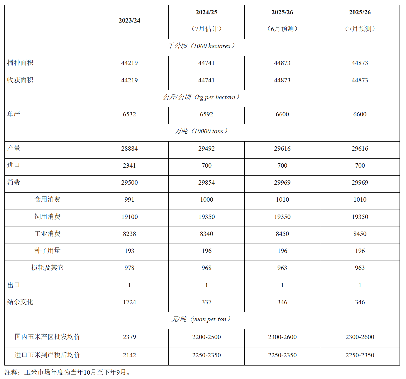 玉米:本月对中国玉米供需形势预测与上月保持一致。目前,东北地区大部气温偏高,降水偏多,土壤墒情适宜,西北地区东部、华北、黄淮等地降水有效改善土壤墒情,总体利于玉米生长发育。未来10天,北方地区局地需防范强降水造成农田渍涝灾害,黄淮地区晴热少雨,应根据墒情及时灌溉。近期储备玉米连续投放入市,以溢价成交为主。国内玉米市场供应相对充足,消费需求处于高位,总体呈现供需紧平衡状态。