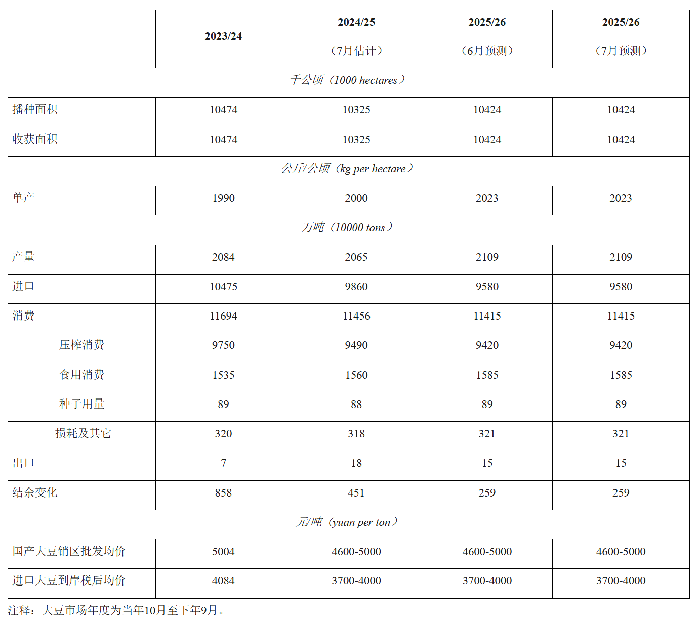 大豆:2025/26年度中国大豆供需预测与上月持平。受高温天气影响,豆制品保质期缩短,消费需求减弱。从生产端看,东北主产区大部土壤墒情适宜,光温水条件总体有利,大豆长势良好;黄淮海地区夏大豆已完成播种,6月末河南、山东等地的降雨显著缓解前期旱情;湖北早熟大豆陆续上市,水分低、品质好于上年。国际方面,全球大豆产量预计延续增势,供需维持宽松格局。北半球大豆进入生长关键期,国际大豆价格将随着主产区天气震荡运行。