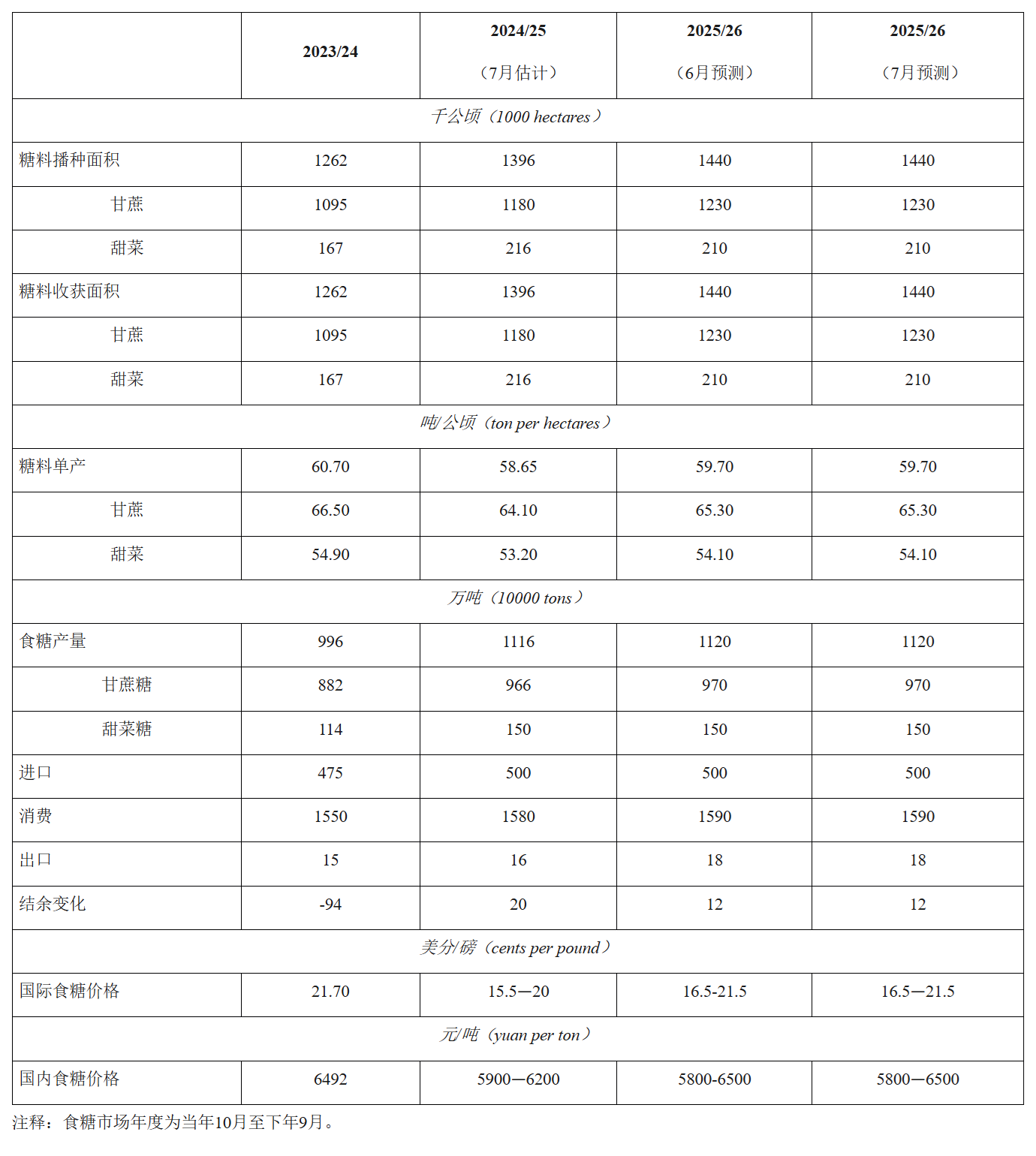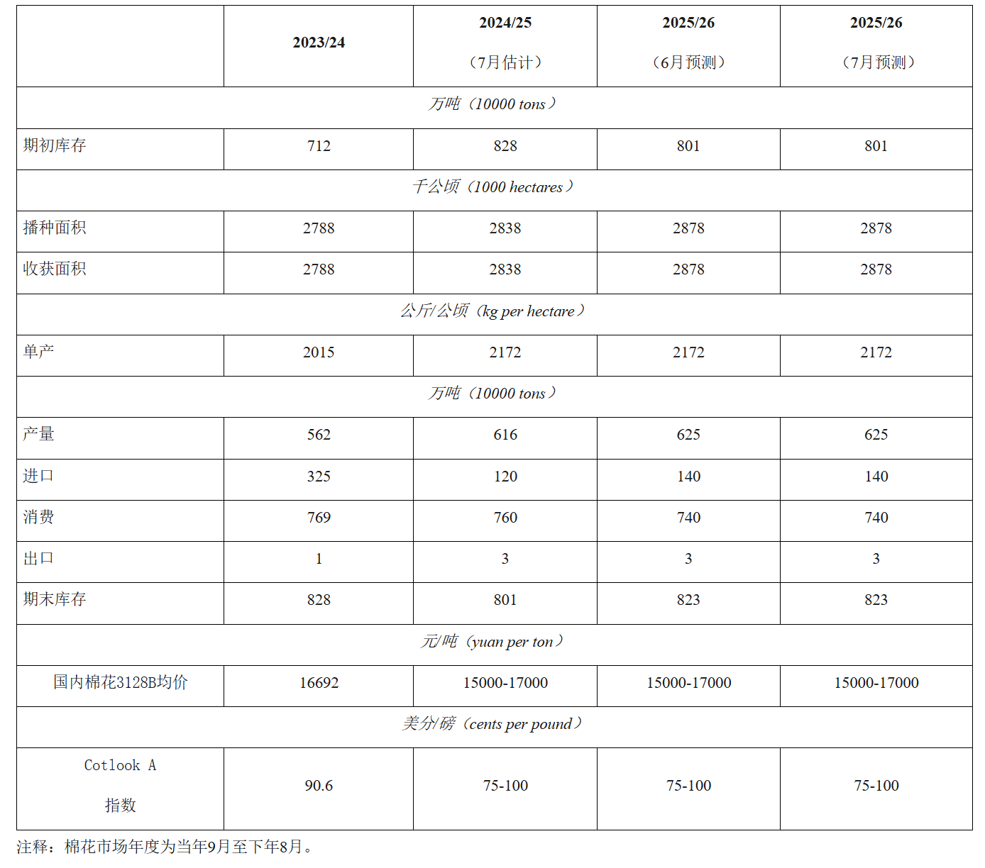 棉花:本月对中国棉花供需形势预测与上月保持一致。6月末,全国大部分产区棉花处于现蕾至开花期,发育期较常年提前4—7天。中国气象局气候预测,7月新疆气温持续偏高,高温日数较常年同期偏多,棉花遭受高温热害风险较高。当前棉花库存总量持续下降,但下游市场淡季特征明显,纺企原料采购谨慎,需持续关注天气扰动和关税不确定性的影响。