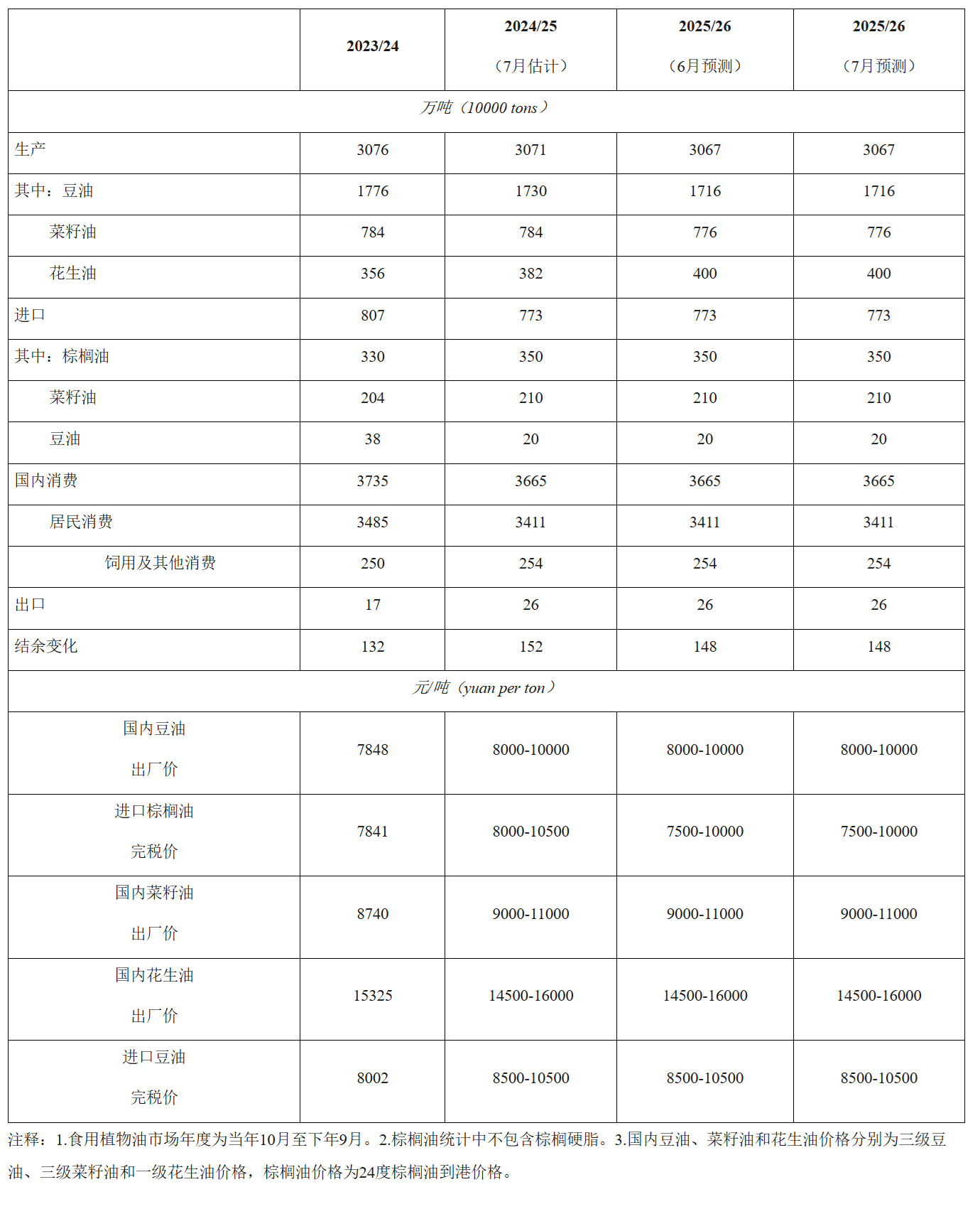 食用植物油:本月对2025/26年度中国食用植物油供需形势预测与上月保持一致。国产新季菜籽产量稳定,品质较好,购销已接近尾声。食用植物油处于传统消费淡季,市场以消耗库存为主。夏播花生处于下针期,近期北方多雨天气有利于其产量形成,但需注意对过湿田块加强排涝散墒,以防范可能带来的病害问题。