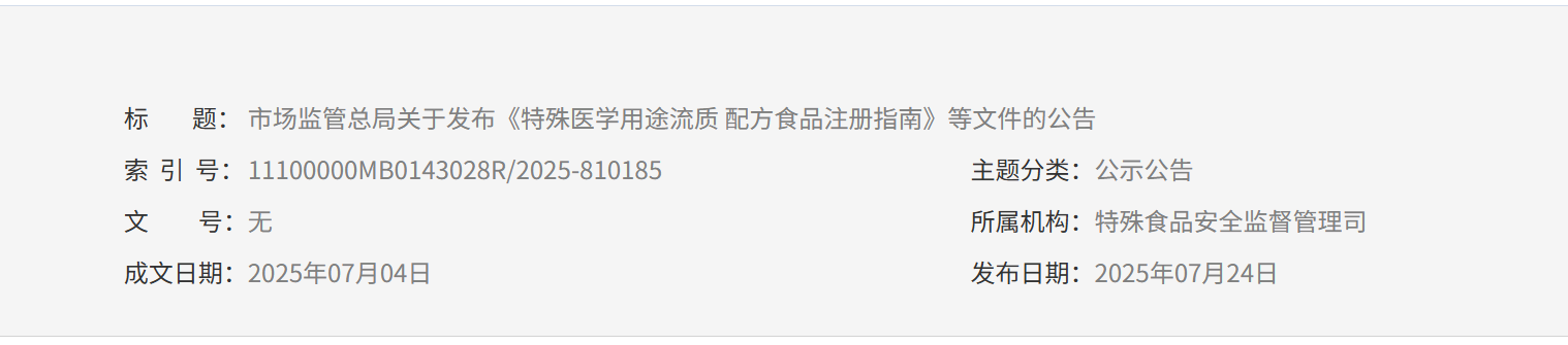 根据特殊医学用途流质配方食品、特殊医学用途增稠组件配方食品的配方研发、生产实际、临床应用和注册实践等情况,为优化上述两类产品注册申请材料、生产现场核查等要求,按照《特殊医学用途配方食品注册管理办法》及有关规定,市场监管总局制定了《特殊医学用途流质配方食品注册指南》《特殊医学用途增稠组件配方食品注册指南》,现予公告。