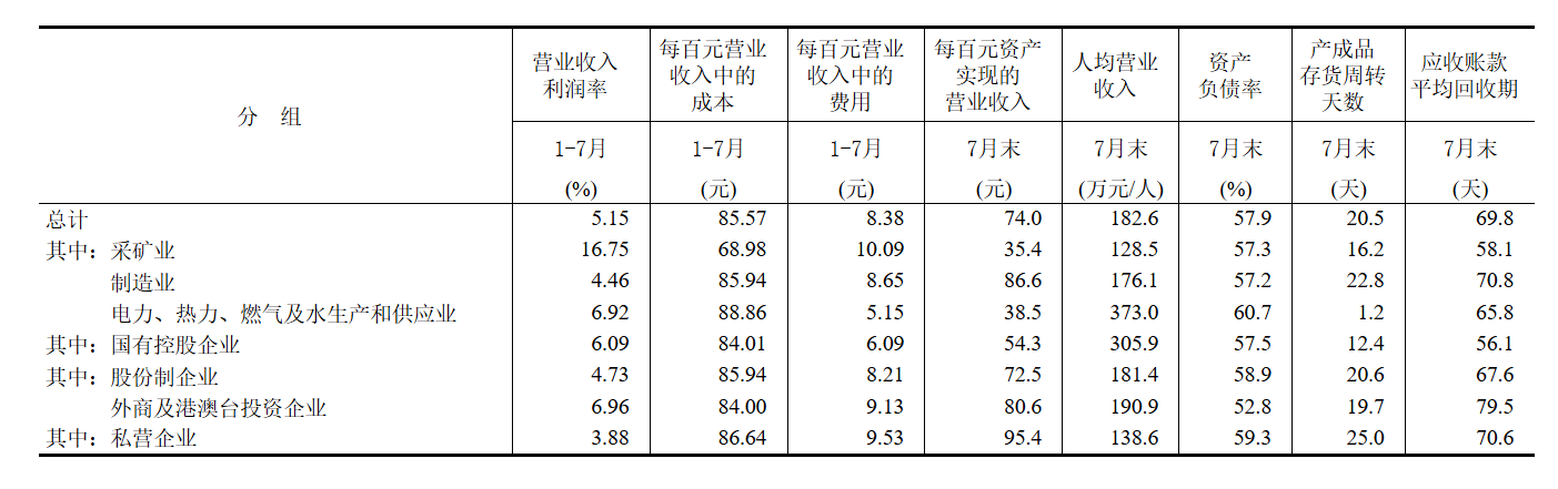 1—7月份,采矿业实现利润总额4930.9亿元,同比下降31.6%;制造业实现利润总额30235.8亿元,增长4.8%;电力、热力、燃气及水生产和供应业实现利润总额5036.8亿元,增长3.9%。