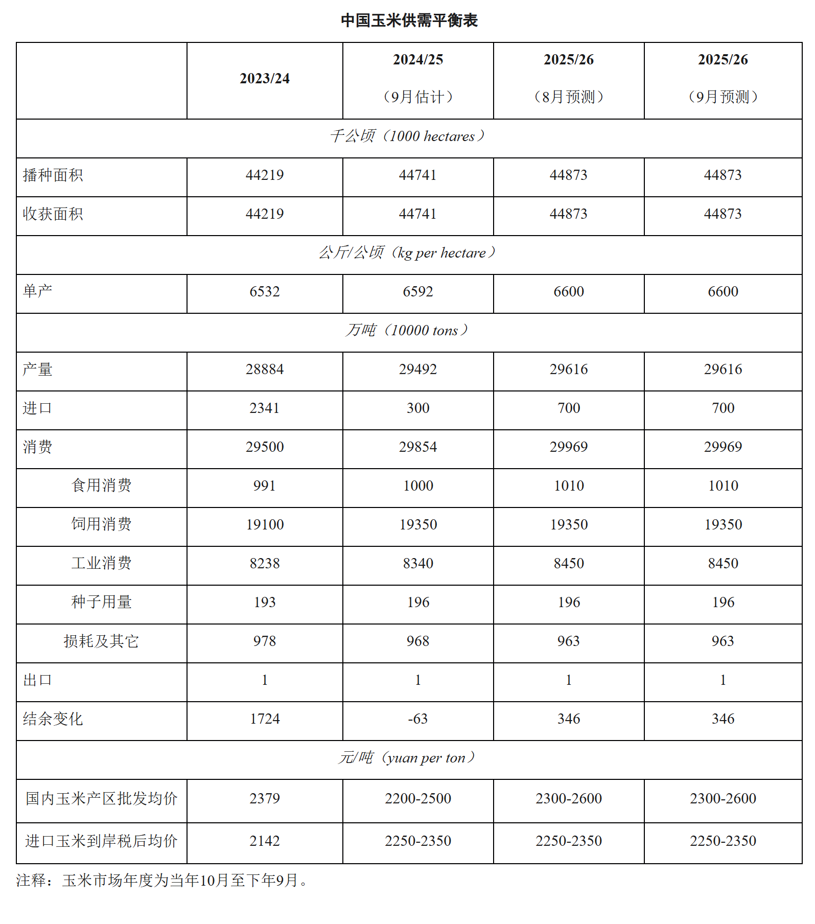 玉米:受进口配额管理和美国滥施关税影响,玉米进口明显减少,本月将2024/25年度玉米进口量估计值调减至300万吨。本月对2025/26年度玉米供需形势预测与上月保持一致。据中国气象局评估,8月份国内玉米产区大部光热条件好,墒情较为充足,作物长势好,预计9月份大部产区光温正常,利于玉米灌浆成熟,但黄淮大部、西北地区东部降水偏多,需注意排湿散墒,防范后期倒伏风险。新季玉米集中上市期临近,贸易商持续出售手中余粮,陈季玉米价格稳中偏弱运行。但今年以来进口保持低位,国家储备调控力度较大,贸易商普遍盈利,各类主体收购新季玉米积极性较高。