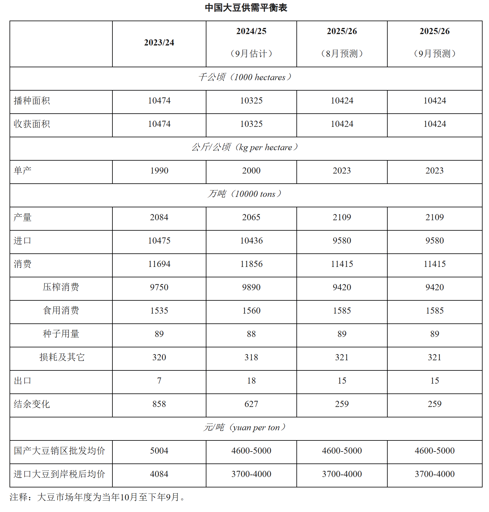 大豆:本月估计,2024/25年度,中国大豆进口量1.04亿吨,较上月估计数调增576万吨,主要原因是油厂压榨利润改善,进口需求高于前期预期;大豆压榨量相应调增至9890万吨。2025/26年度供需形势预测与上月保持一致。主产区大豆作物整体长势正常偏好,丰产预期较强,东北新豆陆续收割上市,市场平稳运行。