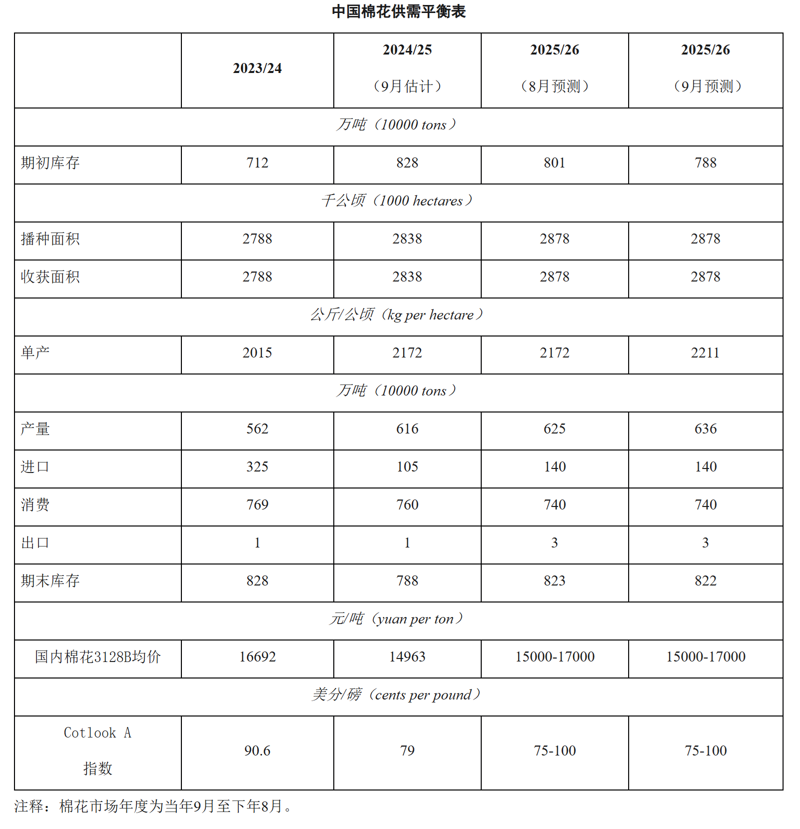 棉花:2024/25棉花市场年度结束,国内3128B级棉花均价每吨14963元,Cotlook A指数均价每磅79美分,均处于估计区间。棉花进口低于预期,本月将2024/25年度进口量调至105万吨,期末库存下调至788万吨。新季棉花播种以来,全国棉区综合气象条件适宜,长势总体好于上年。本月将2025/26年度棉花单产调增至每公顷2211公斤,产量调增至636万吨。纺织市场进入“金九银十”传统旺季,棉花需求有望阶段性回暖,价格存在上涨动力。