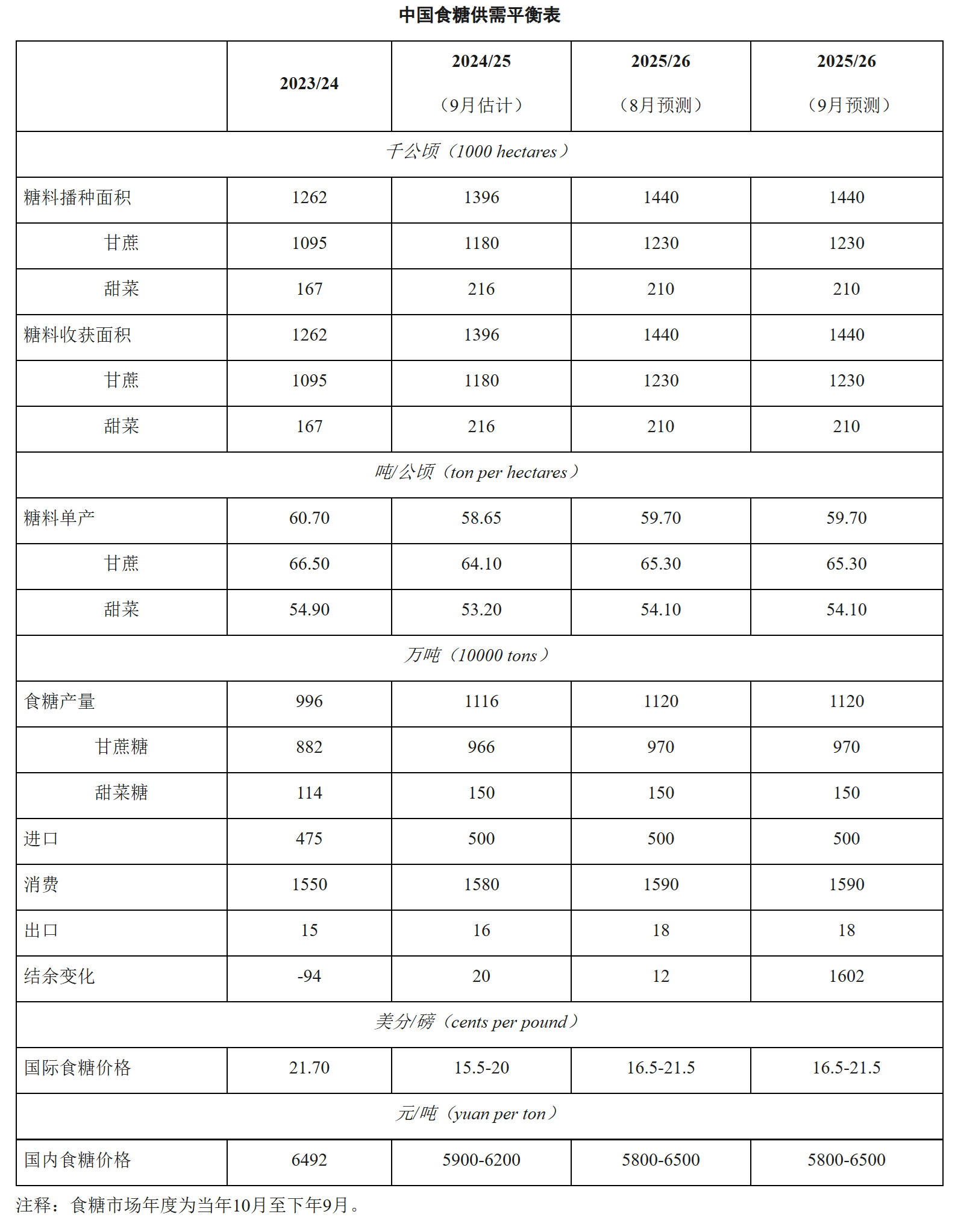 食糖:本月对中国食糖供需形势预测与上月保持一致。南方产区光热充足、雨水丰沛,甘蔗长势总体良好;新疆甜菜产区受干旱影响,单产略有下降;内蒙古中西部地区降雨偏多,甜菜含糖分下降,甜菜起收受影响,糖厂开机时间推迟。巴西食糖生产进度加快,市场维持产大于消预估,国际糖价在近4年低点上方弱势震荡。