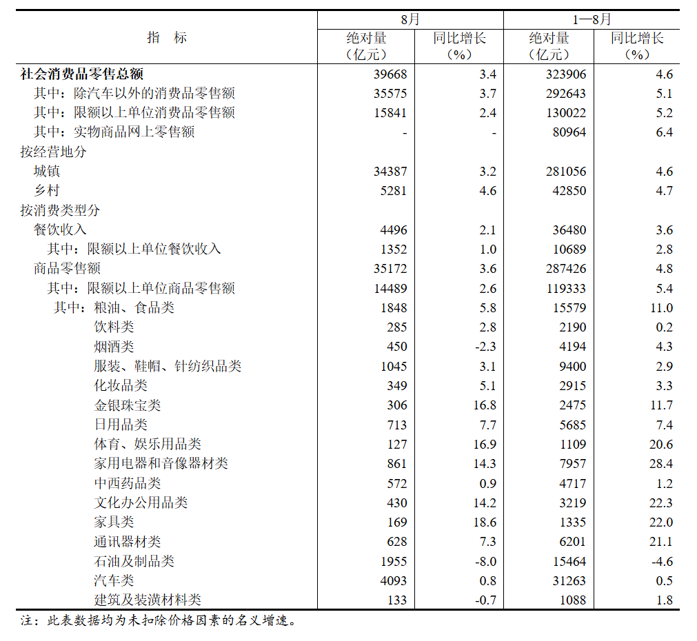 8月份,社会消费品零售总额39668亿元,同比增长3.4%。其中,除汽车以外的消费品零售额35575亿元,增长3.7%。1—8月份,社会消费品零售总额323906亿元,增长4.6%。其中,除汽车以外的消费品零售额292643亿元,增长5.1%。