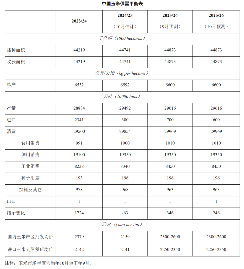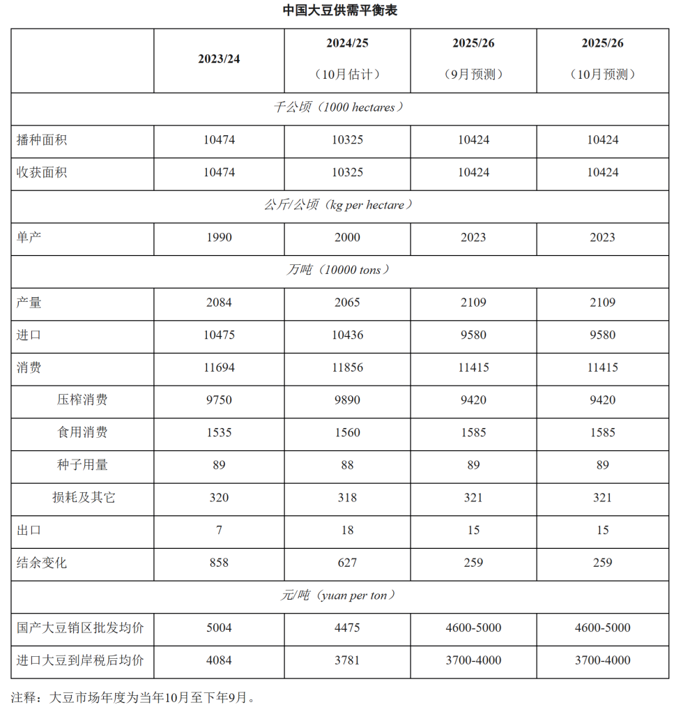 大豆:2024/25年度,国产大豆销区批发均价每吨4475元,较上年下跌10.6%,低于预期价格区间;进口大豆到岸税后均价每吨3781元,较上年下跌7.4%,在预期价格区间内。本月对2025/26年度市场供需数据不做调整。国内市场方面,主产区陆续进入集中收获期。东北产区长势总体良好,结荚鼓粒饱满,丰产预期较强;苏鲁豫皖产区部分地区因生育期遭遇高温干旱及9月下旬持续阴雨天气,对新豆单产和品质形成不利影响,后期需持续跟踪评估。当前东北地区贸易主体入市积极,市场优质优价特征明显,华北黄淮地区大豆上市推迟,市场交易清淡。国际市场方面,美豆主产区温暖干燥,利于大豆成熟与收割推进;南美新季播种进入关键阶段,巴西干旱天气不利于后续进度,阿根廷土壤墒情改善有利于早播。总体来看,全球大豆供应保持宽松状态。