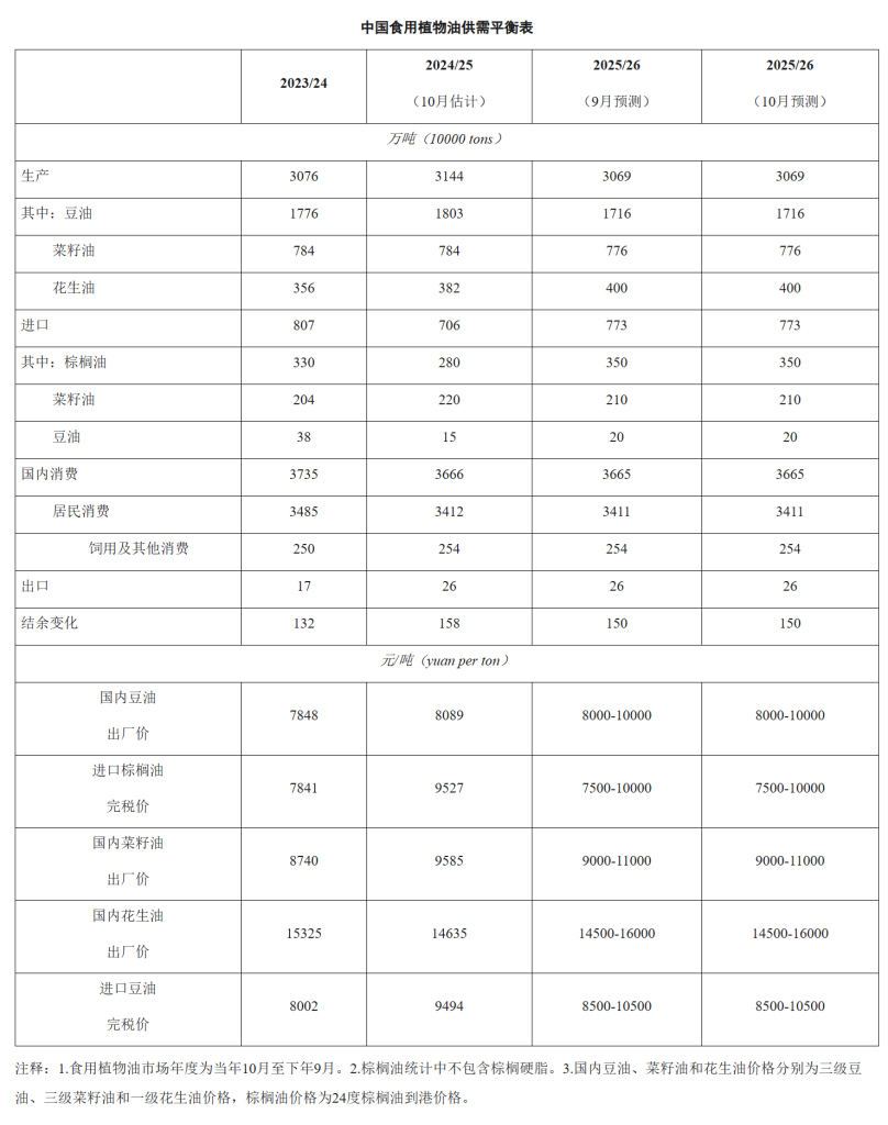 食用植物油:本月,2024/25市场年度结束,中国食用植物油产量3144万吨。由于产量增加,2024/25年度食用植物油进口量较上月调减50万吨至706万吨,其中棕榈油、葵花籽油进口量分别调减30万吨、20万吨。2024/25年度国标三级豆油、三级菜籽油、一级花生油出厂价均价分别为8089元/吨、9585元/吨、14635元/吨,均在预估区间内。本月对2025/26年度中国食用植物油供需预测数据不做调整。据气象部门预测,10月份华北西部、黄淮西北部区域降水偏多,相应花生产区需做好抢收工作,并及时晾晒和烘干,防止新季花生霉变。
