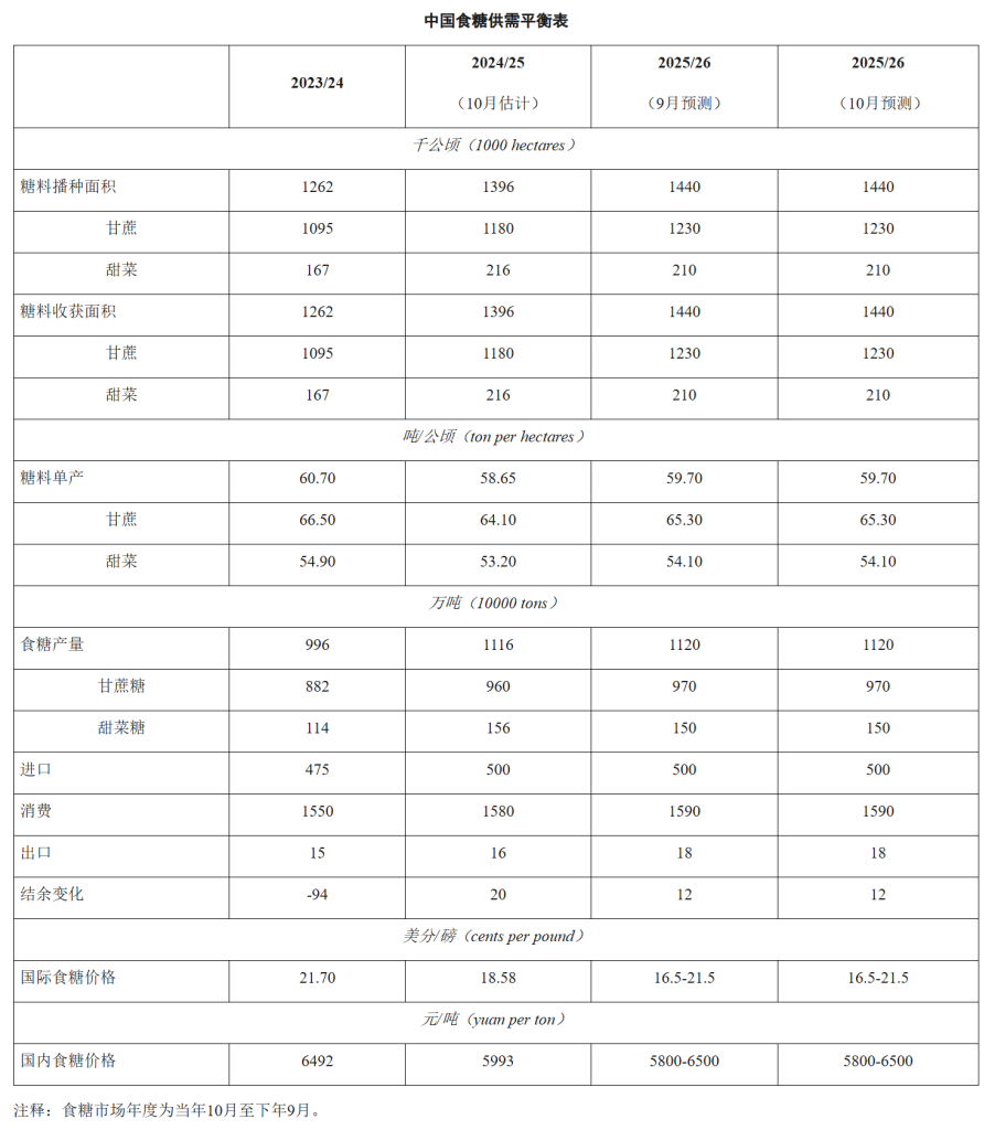食糖:2024/25年度中国食糖产销结束,累计产糖1116万吨,较上年度增加120万吨;食糖年度均价为每吨5993元,在预测范围内,比上年度每吨跌498元,跌幅7.7%;国际原糖年度均价为每磅18.58美分,在预测范围内,比上年度每磅下跌3.1美分,跌幅14.3%。本月对2025/26年度中国食糖供需形势预测与上月保持一致。8月份内蒙古降雨偏多,不利于甜菜糖分积累及起收,糖厂开机时间推迟,对甜菜糖产量的影响需进一步跟踪评估。9月底10月初广东、广西等甘蔗主产区受台风影响,出现甘蔗倒伏等现象,后期需持续关注灾后甘蔗生长恢复情况。