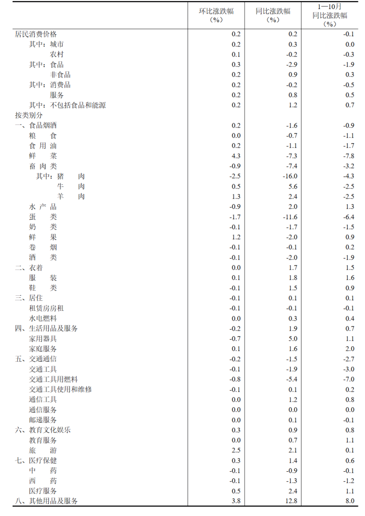 10月份,全国居民消费价格环比上涨0.2%。其中,城市上涨0.2%,农村上涨0.1%;食品价格上涨0.3%,非食品价格上涨0.2%;消费品价格上涨0.2%,服务价格上涨0.2%。
