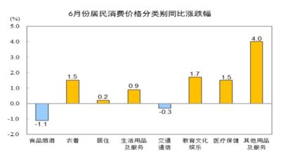 2024年6月份,全国居民消费价格同比上涨0.2%。其中,城市上涨0.2%,农村上涨0.4%;食品价格下降2.1%,非食...