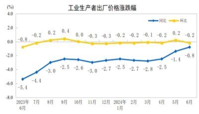 2024年6月份,全国工业生产者出厂价格同比下降0.8%,降幅比上月收窄0.6个百分点,环比由上月上涨0.2%转为下降0...