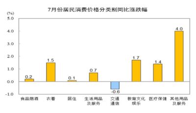 2024年7月份,全国居民消费价格同比上涨0.5%。其中,城市上涨0.5%,农村上涨0.7%;食品价格持平,非食品价格上...
