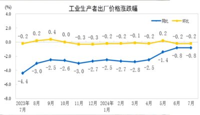2024年7月份,全国工业生产者出厂价格同比下降0.8%,环比下降0.2%,降幅均与上月相同;工业生产者购进价格同比、环...