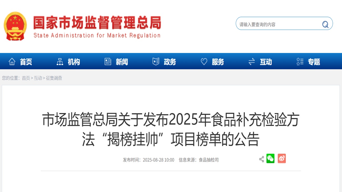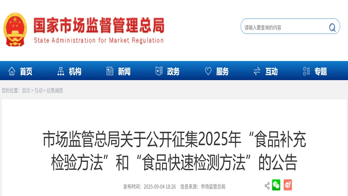 为强化食品安全监管技术支撑,现公开征集2025年“食品补充检验方法”和“食品快速检测方法”,有关事项和要求如下: 一、征...
