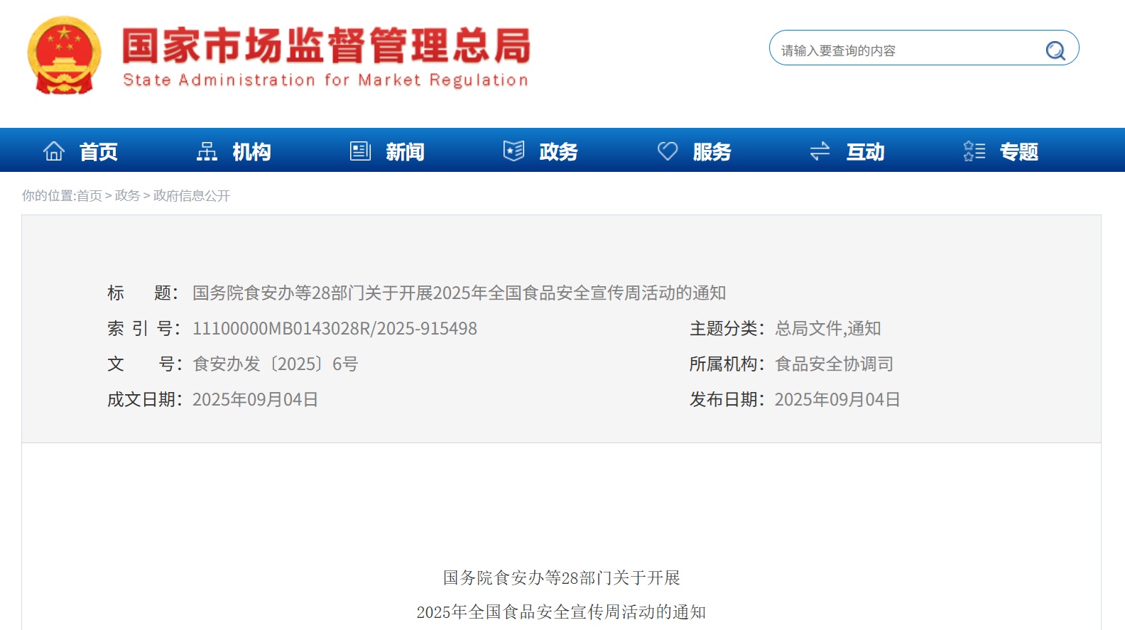 国务院食安办等28部门关于开展 2025年全国食品安全宣传周活动的通知 根据《中共中央、国务院关于深化改革加强食品安全工...