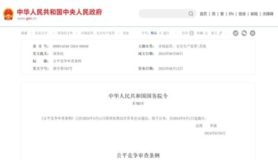 中华人民共和国国务院令 第783号 《公平竞争审查条例》已经2024年5月11日国务院第32次常务会议通过,现予公布,自...